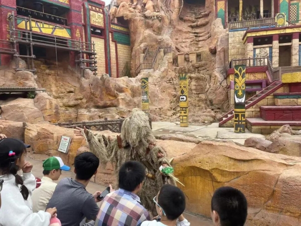同样启用"野人"NPC的还有北京欢乐谷。玛雅区是北京欢乐谷的主题部分之一,"野人"NPC(即游戏中的非玩家角色,现常用于乐园中与游客互动的人物)是最大特色。在木质围栏和小木屋组成的情景式露天小剧场内,身着"野人"服饰的演员们载歌载舞,还会随机挑选游客,"扔"进一口悬挂的大锅中,增加参与感。