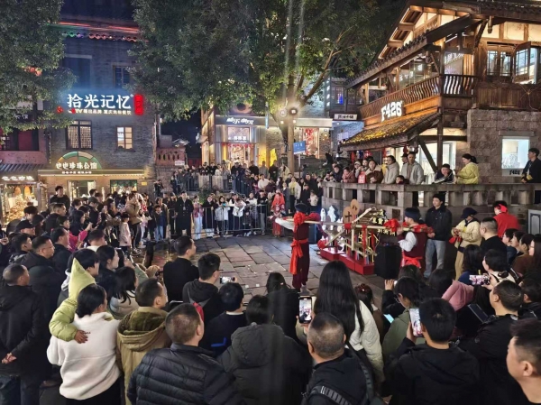 丰富多元的文旅服务供给,成为点燃新春消费热潮的核心动力。以"渝你相约·欢喜过年"为引领,重庆通过"六大主题活动、四大惠民举措、四大川渝联动"三维发力,统筹推出1300余场迎新春促消费活动,撬动市场让利超20亿元。"新韵重庆"无人机灯光秀、园博园"禧欢霓"大型水上灯会璀璨夺目,《极限快乐Show2》《重庆·1949》等精品演艺轮番上演,"渝味360碗"美食推广、非遗年货展销等活动再现传统年俗;武隆、丰都等冰雪景区成功将"冷资源"转化为"热经济","博物馆里过大年""马年中匈艺术对话"等活动则实现了传统文化与国际交流的双向奔赴。与此同时,8000万元文旅消费补贴及消费券、50家景区门票减免等惠民举措精准滴灌,让市民游客切实享受红利;巴蜀文旅走廊主题列车、"一张票根游川渝"等联动活动,进一步凸显了巴蜀文脉的独特魅力。