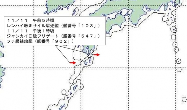当天上午5点,055大驱"鞍山舰"最先出现在口永良部岛西约120公里海域,随后向东径直通过大隅海峡直奔太平洋深海。下午1点左右,054A飞弹护卫舰"临沂"号和903型综合补给舰"东平湖"号成对出现以同样路径进入太平洋。