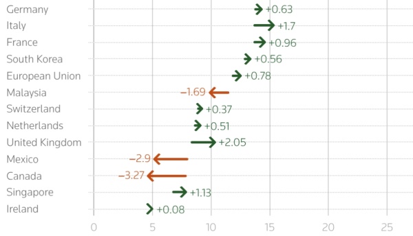 据《金融时报》早前报道,新关税实行后,欧盟的整体平均关税将较美欧协议约定上升0.8个百分点;若将1100项原定豁免品类计入其中,意大利、法国受冲击最为明显。