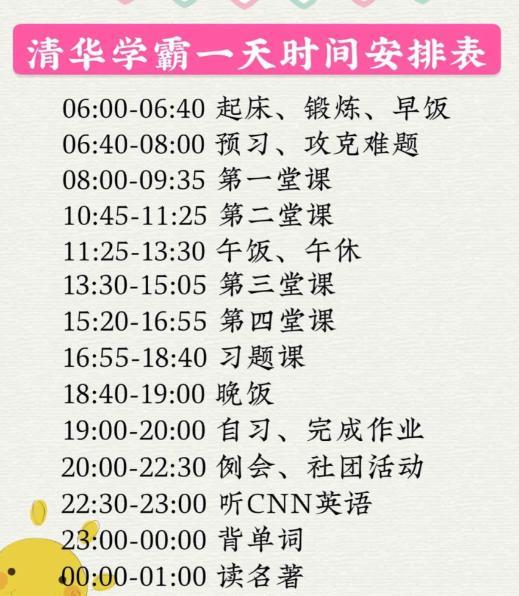 在这样的作息中,他们六点起床,六点四十分开始学习,凌晨一点睡觉,一整天的日程都排得满满的。重点是,除了上课时间,自由时间也安排得非常严格,比如读经典、听英语、锻炼身体,这些都包含在房费里了。看到清华学霸的日程后,很多同学不禁感叹,我和学霸的差距真的不小,而是几千公里的距离。