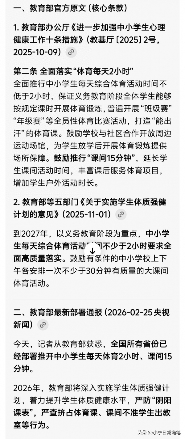 从教育部获悉,全国已经开始推广部署明确中小学生每天体育2小时、课间15分钟。