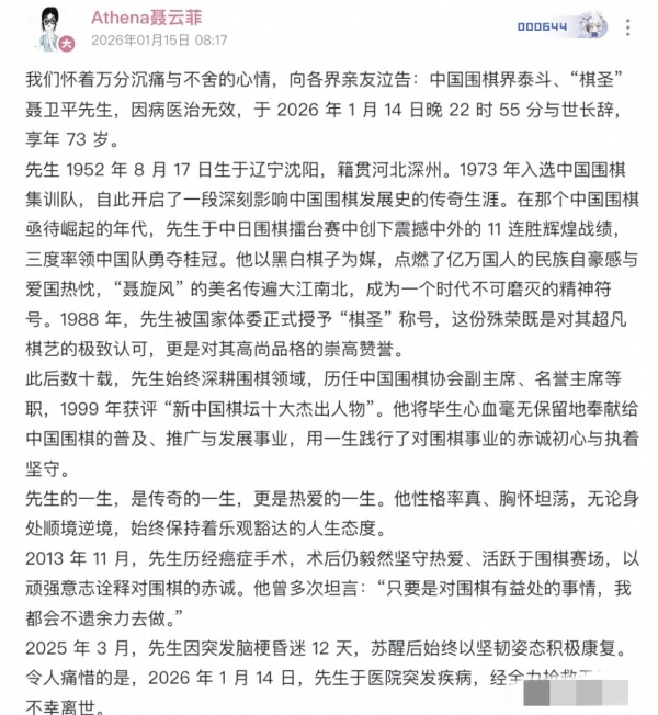 今早聂云菲的讣告刷屏,说父亲聂卫平2026年1月14日晚十点离世,不少老棋迷盯着手机发呆,想起去年还看他在围棋活动上笑谈往事。
