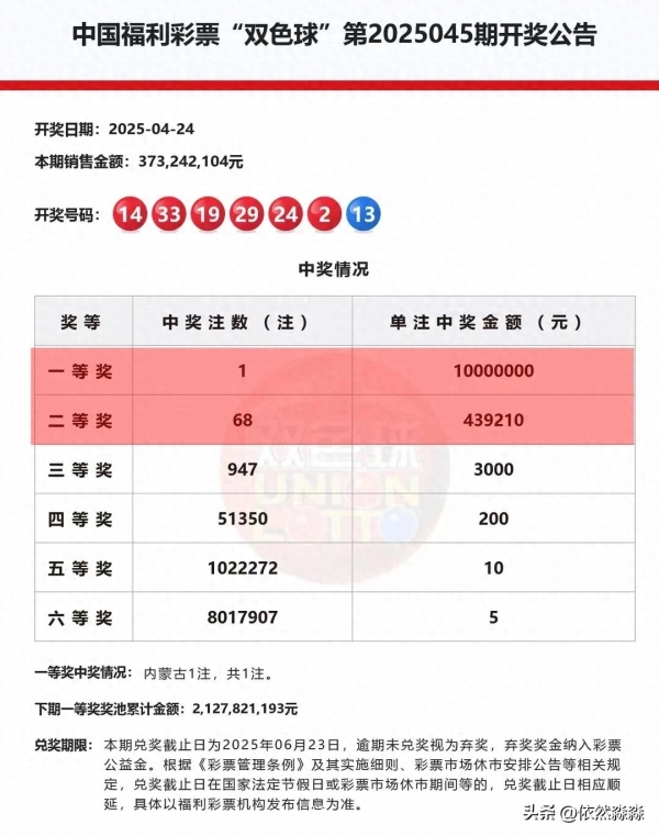 4月24日星期四双色球[25045]期中奖号码已公布