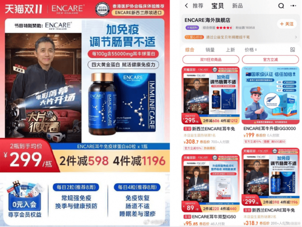 其晒出的图片显示为一家名为"ENCARE海外旗舰店"的店铺,该店铺标识中含"天猫国际"字样,其售卖的产品中,有一款名为"新西兰ENCARE耳牛免疫球蛋白"的商品,商品首页图放置了梁朝伟半身照片。