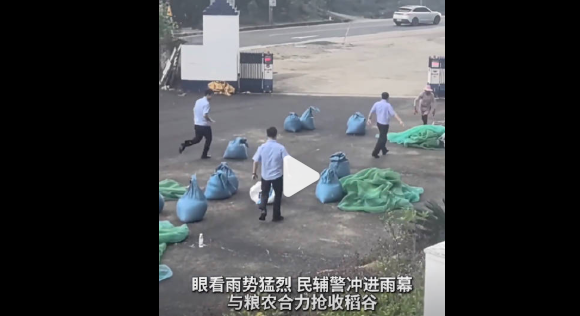 近日,福建德化赤水派出所院内,村民晒粮突遇暴雨来袭。雨势猛烈,民辅警纷纷冲进雨中,与村民合力抢收稻谷。