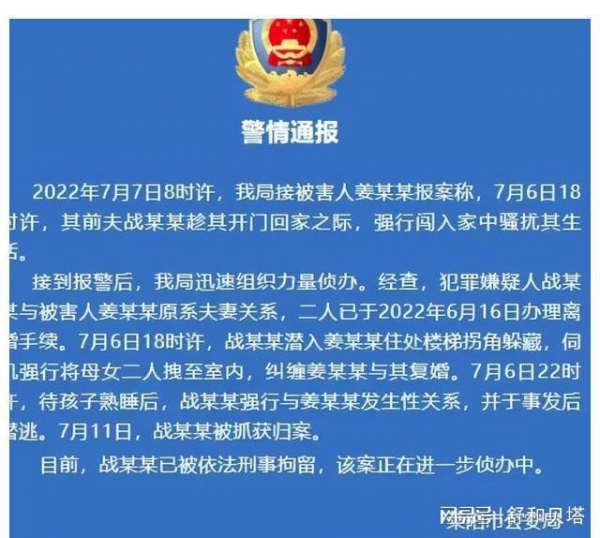 其实在案发的第二天也就是7月7日,姜某就报了案,称其前夫战某强行闯入其家中骚扰其生活。