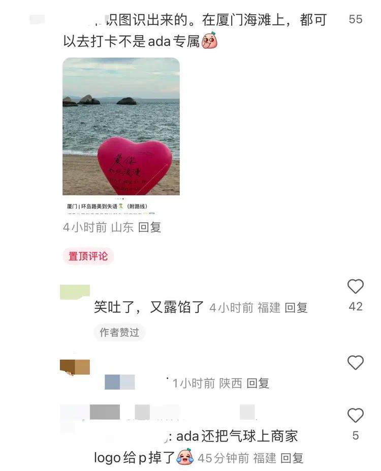 很快就有网友扒出这是厦门海滩上一些商家搞活动布置的气球,原图上还有商家的logo,而从张馨月发出来的图片来看,她还很细心地把商家logo修掉了。