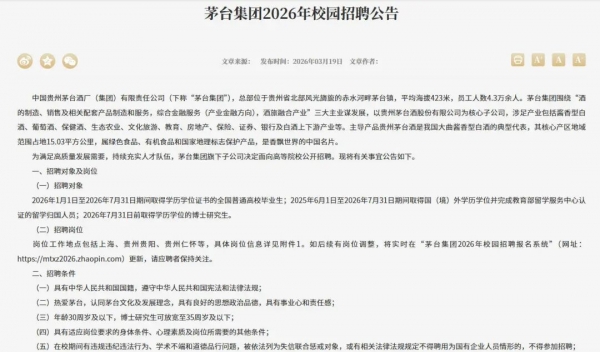 记者从茅台集团官网了解到,为满足高质量发展需要,持续充实人才队伍,茅台集团发布2026年校园招聘公告,茅台集团旗下子公司决定面向高等院校公开招聘,拟招聘89人,涉及酒体设计师、防伪技术研究、酿造作物研究、食品风味与安全、检验检测员等42种岗位。