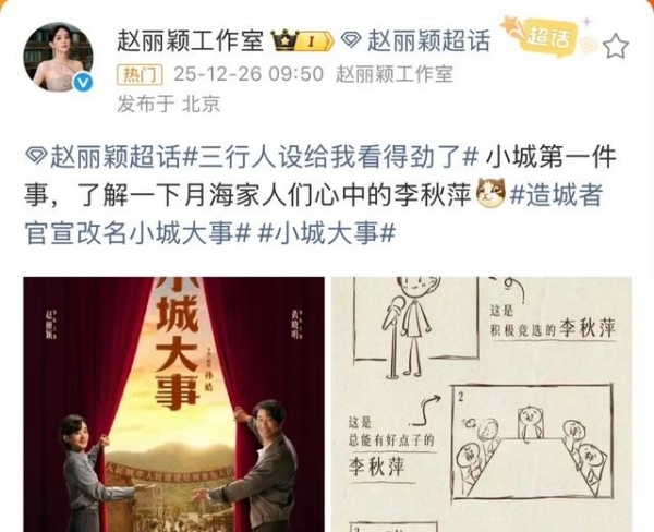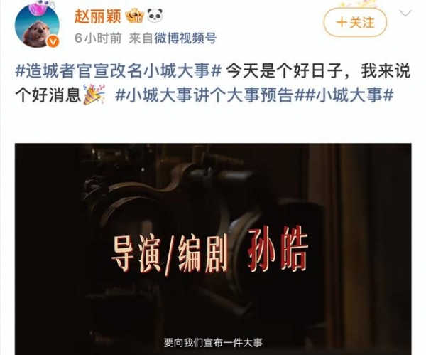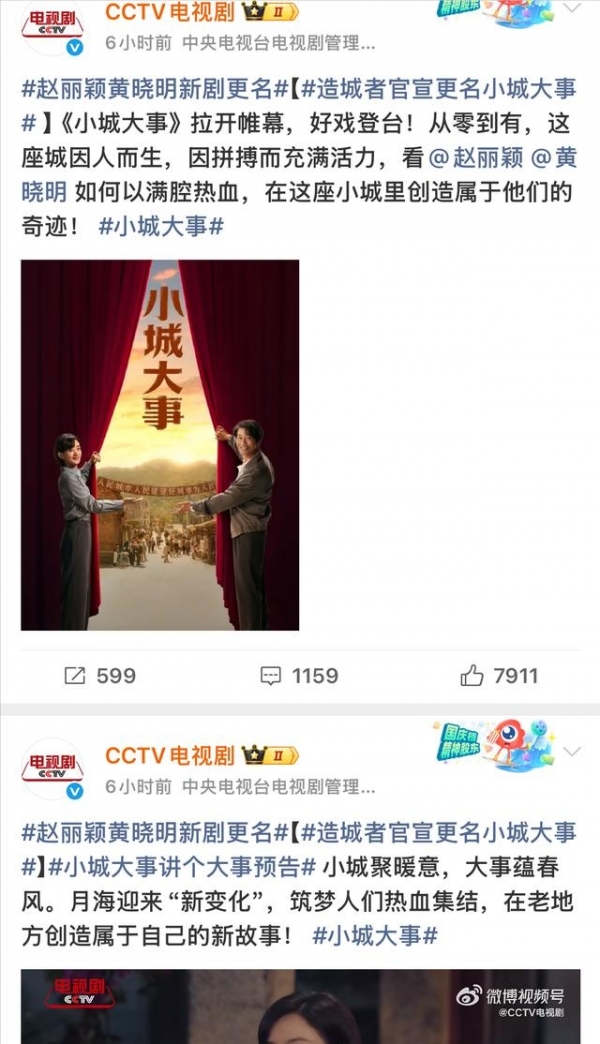 这句看似平平无奇的话,后面跟着的,是央视官微、CCTV电视剧官号、平台方一起连环官宣:《造城者》改名《小城大事》,通过了,定为重点项目,央八上星,腾讯独播,朱媛媛遗作,赵丽颖、黄晓明领衔。