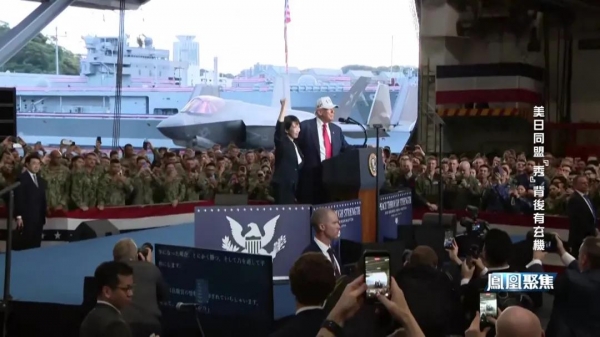 在航母上,特朗普把高市早苗介绍给在场的士兵,称她为胜利者。高市早苗受邀发言,再次不失时机提醒特朗普"印太战略"以及美日同盟的价值。
