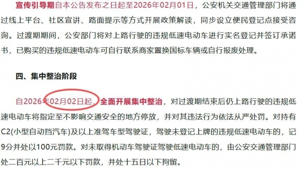 2026年2月2日起,贵州省毕节市金沙县公安交管部门将依据公安局、市场监督管理局、交通运输局等多部门联合发布的《关于开展低速电动车道路交通秩序专项整治的公告》要求,在全县范围内全面开展低速电动车集中整治工作。