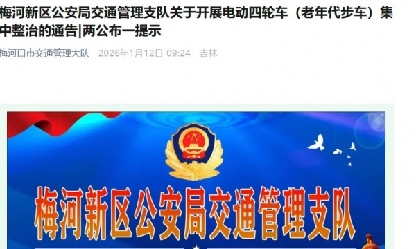 根据吉林省梅河口市梅河新区公安局交通管理支队发布的《关于开展电动四轮车(老年代步车)集中整治的通告》,公安交管部门将在2026年起在城区范围内集中开展电动四轮车专项整治行动。