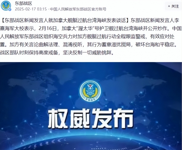 2月17日深夜3时15分,东部战区突然发布了一则消息,内容显示,2月16日,加拿大"渥太华"号护卫舰过航台湾海峡并公开炒作,解放军东部战区组织了海空兵力对过航我国台湾海峡的加舰进行了全程的跟监警戒,有效应对处置。