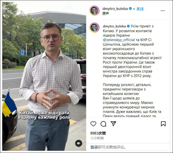 "你好乌克兰,来自遥远中国的问候。这是一段漫长的旅程,需要两天时间,但是值得的。因为这次访问关乎乌克兰的和平,值得付出任何努力和时间。我们希望尽快实现和平。"库列巴在北京时间23日深夜发布于Instagram的视频中宣布已抵达中国。