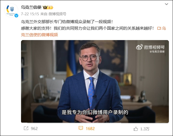 在库列巴抵华前一天(22日),乌克兰驻华大使馆在其微博账号@乌克兰信使 上发布了一则库列巴专门为中国网友录制的视频。