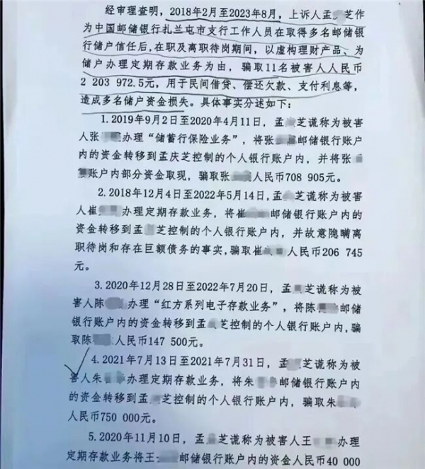 法院审理查明,2018年2月至2023年8月,孟某芝作为邮储银行扎兰屯市支行工作人员在取得多名邮储银行储户信任后,在职及离职待岗期间,以虚构理财产品、为储户办理定期存款业务为由,骗取11名被害人人民币220多万元,用于民间借贷、偿还欠款、支付利息等造成多名储户资金损失。