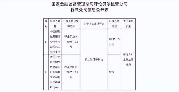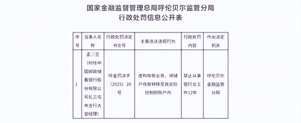 国家金融监督管理总局呼伦贝尔分局在监管中发现,该银行存在内控管理不到位、员工行为排查流于形式等问题,孟某芝早在2021年1月就因违规兼职被要求离职待岗,却仍身着制服在银行从事业务直至2023年8月被正式开除,期间持续实施诈骗行为。