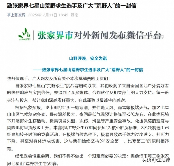 12月2日晚,张家界七星山"荒野求生"挑战赛组委会发布情况说明,称选手"刀疤哥"因肠胃不适主动退赛,决赛剩余选手10人。