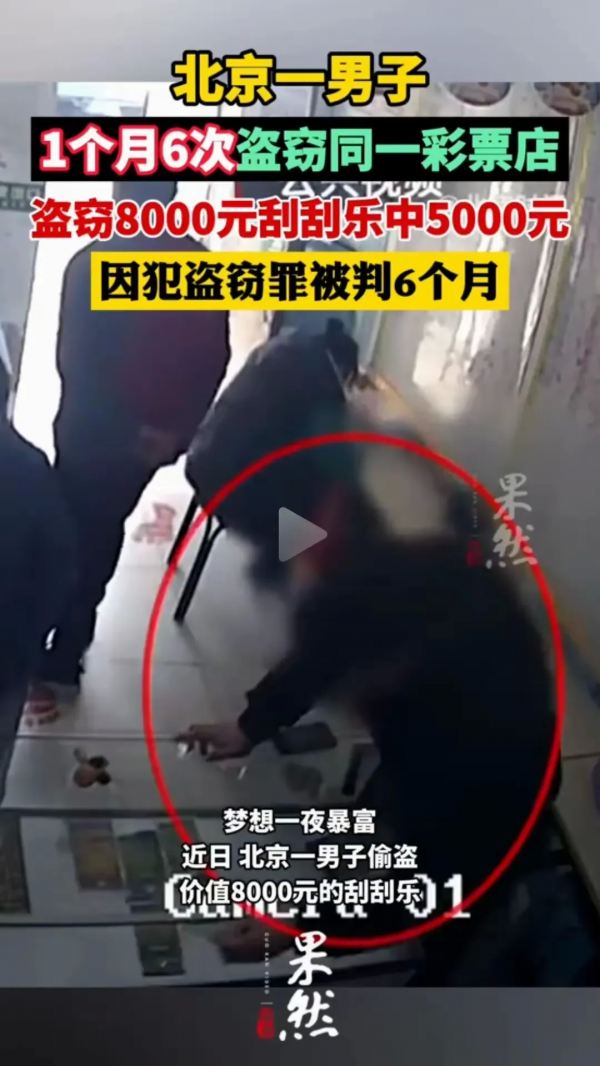 此后一个月,马某接连6次偷彩票,涉案8000多元,可只中了5000元。彩票店老板娘发现兑奖记录不对,一看监控,马某的行为全暴露了,报警后马某被抓,最终被判拘役6个月并处罚金。