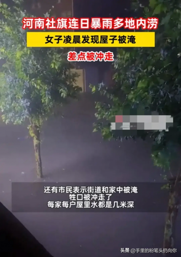 还有居民表示,街道和家中被淹,牲口被冲走,每家每户屋里水都有几米深,家电被泡,粮食被冲走。