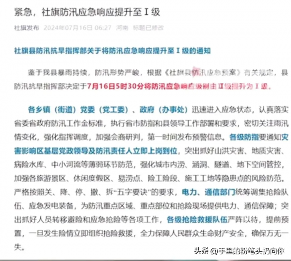 据社旗发布的官微消息,7月16日5时30分,防汛应急响应级别由二级提升为一级。