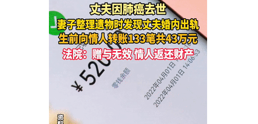 真解恨!梁女士和谭先生是夫妻关系,2022年的8月,谭先生因为肺癌医治无效去世了,之后梁女士整理丈夫的遗物时,意外发现丈夫竟然出轨了,还通过手机转账给小三刘某转了133笔,累计金额达434396.56。