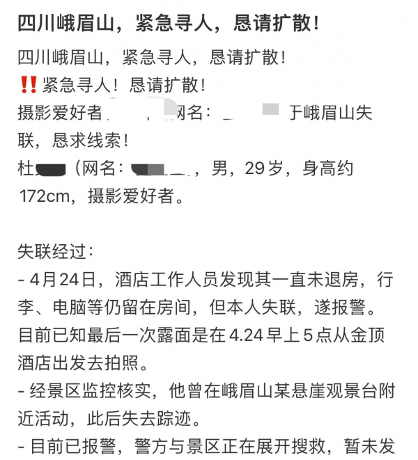 据多家媒体的消息:此前在峨眉山失联的29岁小伙已经被发现,确认遇难,警方目前判定为自杀。