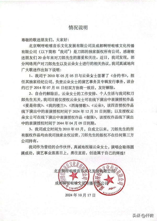 或许是感受到了舆论的压力,云朵也开始进行"危机公关",为了平息外界对自己与刀郎关系的质疑,云朵先后三次发声,第一次是在昆山的个人演唱会上,她哽咽着说:"我永远是刀郎的徒弟,师父和师娘,是我的再生父母,"当时的她,唱着刀郎授权的歌曲,试图用真情流露来挽回粉丝的心