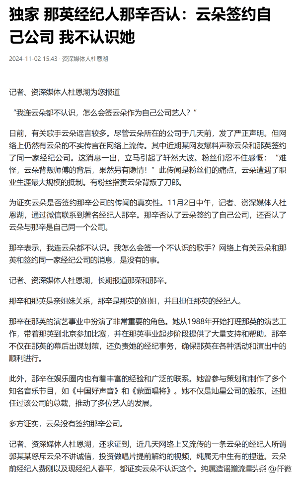 而第三次,则是通过经纪公司发表了一份严正声明,解释了当年解约的缘由,并强调与那英完全没有关系
