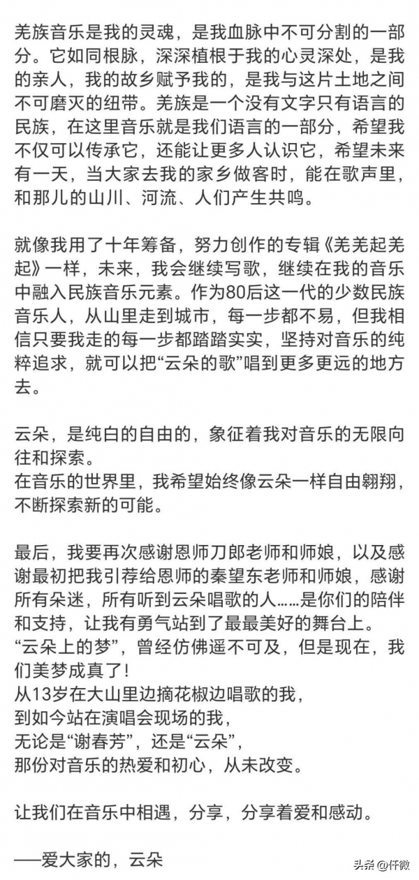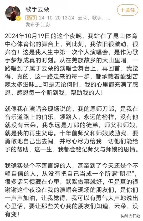 第二次,她是在演唱会结束后,在社交平台上发长文,再次强调自己对刀郎的感激之情,试图用文字来打消外界对她的质疑