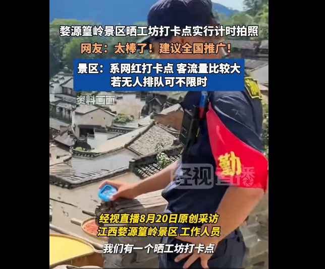 经视直播8月20日原创采访,江西婺源篁岭景区工作人员:我们有一个晒工坊打卡点,正常如果有(游客)排队的情况下,会有个工作人员在旁边计时,如果后面完全没有人在等待的话可以不计时的,但正常那个地方属于一个网红打卡点,客流量还是比较大的。