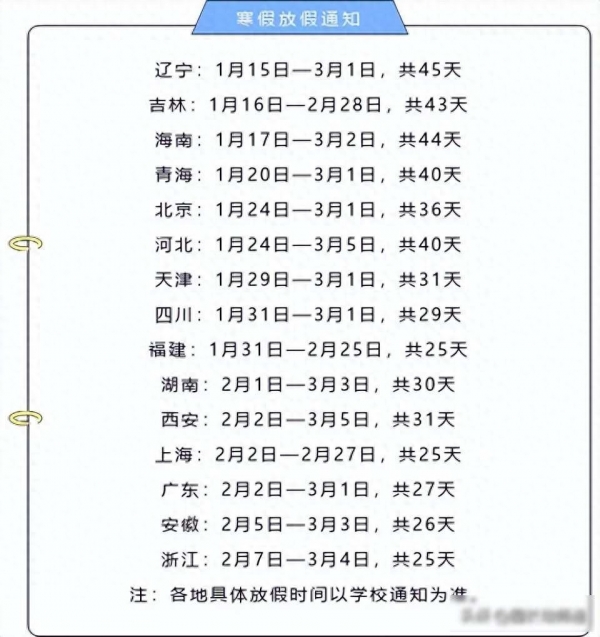 这回放假时间真有点乱,东北那边,黑龙江、吉林的孩子们一月中下旬就放学了,一放就是两个月,长春的学生得熬到三月一号才回学校,上海、浙江这边却要等到二月初才放假,二月底就得回去,二十五天一晃就没了,海南更怪,一月十七号就放,开学却拖到三月二号,南方日子过成了北方的样儿。