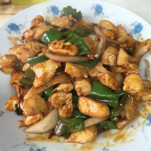 2、起锅加油烧热,倒入腌好的鸡胸肉,小火煸炒至变色,盛出备用。锅里留底油,放入一勺豆豉炒出豉香味,放入洋葱、青椒快速翻炒一会儿;等到变软后加入生抽、白糖调味,倒入炒好的鸡肉,大火翻炒均匀即可出锅。