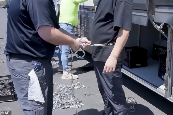 从公布的画面看,那些手无寸铁的工人被逮捕时,被施以了较重的管束措施,包括戴上镣铐,从手腕到腰部再到脚踝,都被束缚了起来。