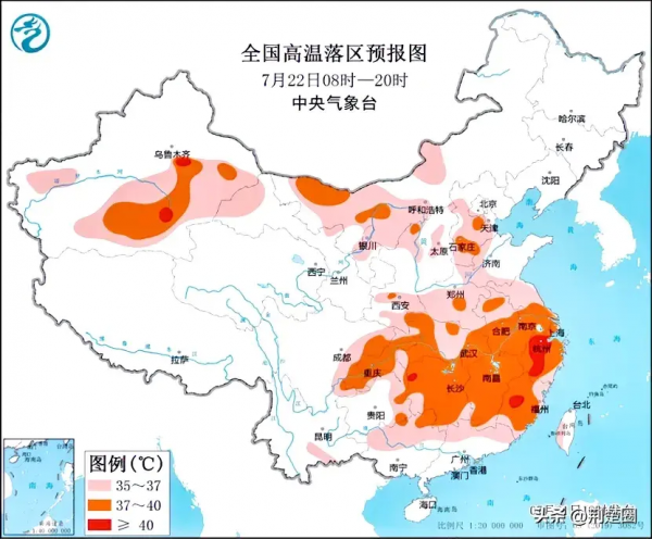 根据气象部门消息,中央气象台预计,7月22日白天,新疆南疆盆地、内蒙古中西部、宁夏、陕西北部、山西中部、京津冀、黄淮中西部、江汉、江淮、江南、华南北部、贵州东部和北部、四川东部、重庆等地有35℃以上高温天气。其中南疆盆地东部、河北中南部、苏皖中南部、上海、浙江、福建、江西、湖南、湖北西部和东部、重庆、四川东部等地部分地区最高气温37~39℃,局地可达40℃以上。