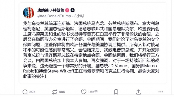 据悉,此次会谈的重点是对乌克兰的安全保障和美俄乌三方会谈问题,对于前者,特朗普的态度出现了松动,表示美国愿意在欧洲主导的前提下"协调参与",甚至不排除派出美军进入乌克兰,对于三方会谈,特朗普更是十分积极,甚至做出了在外交场合十分罕见的举动。