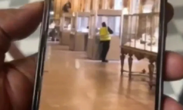 法国媒体公布了一段据信为"窃贼在卢浮宫作案时的视频":在这段游客拍摄的视频中,身穿工人装及黄色反光背心的窃贼看似正在用角磨机打碎展柜。