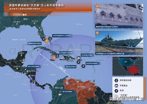 在这个当口,俄罗斯的反击就来了,突然提议向委内瑞拉提供军援,这意味着,委内瑞拉将拥有合适的远程打击力量。这次是由俄罗斯官方背景智库负责人,绰号"渔夫"的专家在2025年8月25日公开发布的提议。他表示,可以向委内瑞拉提供2000架"天竺葵"无人机,并绘制了对美威慑覆盖的示意图。