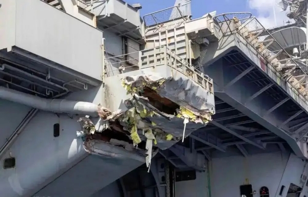 2月14日公布的照片显示,撞击位置位于航母右舷后部升降机的后部外延支撑部分,受损主要集中在吃水线以上的上层甲板,远离核反应堆区域。