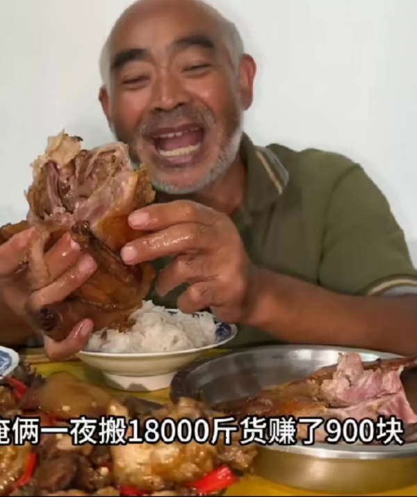 刚刚看到一个视频,一大叔一晚上搬了1万8千斤货,赚了900块钱,买了猪脸和板鸭犒劳自己。