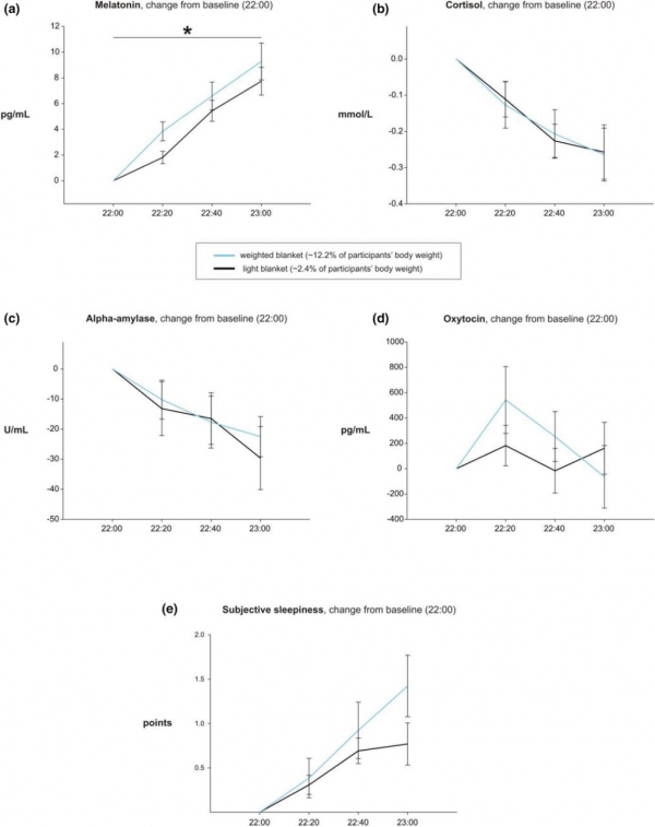 厚和轻被子对唾液中褪黑素(a)、皮质醇(b)、α-淀粉酶(c)、催产素(d)、主观嗜睡评级(e)的影响
