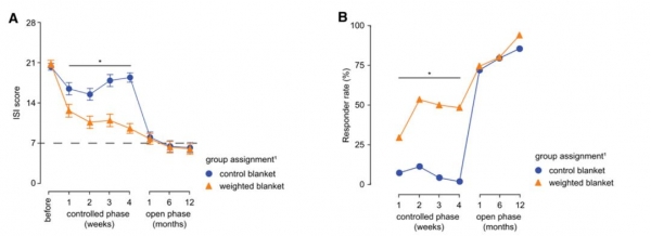 在4周实验结束后,有112名参与者继续参加了为期一年的重毛毯使用实验。而在一年后,所有参与者失眠改善的有效率为92%,完全缓解率为78%。