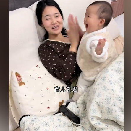 据视频显示,妻子抱着宝宝在床上玩耍时和老公闲聊,说育儿补贴收到了,发了4500,小宝3600,姐姐还有900,老公说给老婆和孩子他们娘仨买新衣服,再给他发200种子钱。
