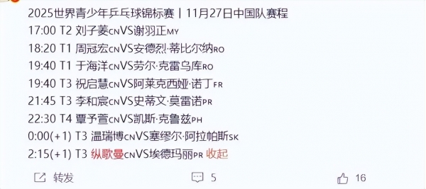 纵歌曼首场的U19世青赛女单的时间已经确定,她的对手是埃德玛丽,大家继续期待这位19岁的年轻小将吧,她2023年12月底才入选国乒一队希望她能继续进步。