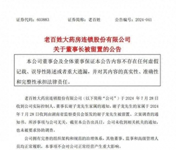 7月30日,老百姓大药房连锁股份有限公司(老百姓,603883.SH)公告,公司于7月28日收到公司实际控制人、董事长谢子龙家属的通知,谢子龙的家属于7月28日收到由湖南省监察委员会签发的谢子龙被留置、立案调查的通知书。所涉事项与公司无关,截至本公告出具日,公司未收到相关机关的通知,也未被要求协助调查。公司其他董事、监事和高级管理人员均正常履职,本事项不会对公司正常经营产生重大影响。