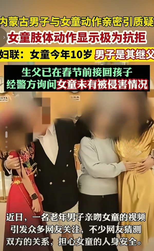 据悉这名男子年龄已经有60岁他搂抱的女孩是他10岁的继女男子和女孩的母亲在今年1月份才领的证,最离谱的是男子的抖音账号里面竟然还有女孩穿着紧身连衣裙和高跟鞋的视频,事情发生以后女孩的母亲说视频只是家庭成员之间的日常玩乐拍摄时自己也在场