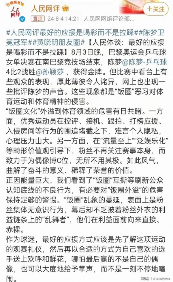除了现场球迷之外,在网络上,也有种种声音,一些球迷在社交媒体平台上开始攻击陈梦,甚至出现造黄谣的情况,用词可以说是不堪入目。为了为陈梦正名,人民日报也是发文力挺陈梦,并且呼吁球迷们抵制饭圈文化,最好的应援是喝彩而不是拉踩,就算不是自己偶像赢球,也应该大度给对手送上掌声。