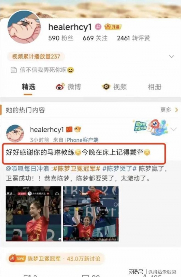 因为赛场球迷的种种行为,陈梦也被不少球迷笑称是"客场夺冠",作为一个奥运冠军,陈梦却被如此区别对待,这让很多球迷都难以置信,作为陈梦的表哥,黄晓明在朋友圈为陈梦发文庆祝的时候,更是被某老总怒怼,孙颖莎和陈梦都是国乒的运动员,不管是谁赢都应该得到球迷的喝彩。