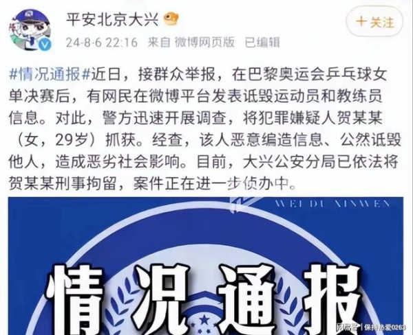 除了人民日报发声力挺陈梦之外,在近日,警方也是正式干预了,对在社交媒体平台上造陈梦黄谣的贺女士,正式进行了刑事拘留。随着警方的介入,一些不理智的球迷也该清醒过来了,陈梦赢球并没有错,应该得到喝彩,而孙颖莎输球同样也应该得到喝彩,这一次没有夺冠,未来还是有机会的。